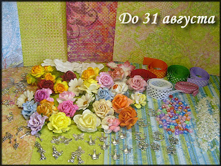 | Конфетка от магазина http://www.scrapbooksale.ru/ до 22 августа В конфетку входит - шикарный набор плотной бумаги с различными эффектами "Mariposa" (48 листов); - тканевые цветочки с бисером от Petaloo; - сахарные розочки от Prima marketing; - заготовки для изготовления открыток от Flower soft; - микс Flower soft цвет "Summer"; - дырокол от Martha Stewart "lace heart"; - радужная большая чернильная подушка от Ranger; - чернила Colorbox, цвет Rain forest; - штампик от Sarah Kay; - набор штампов Inkadinkado; - заготовка для мини-альбома "цветок"; - фетровый цветочный бордюр; - тканевая лента от Webster pages; - половинки жемчужинок и страз от Prima Marketing