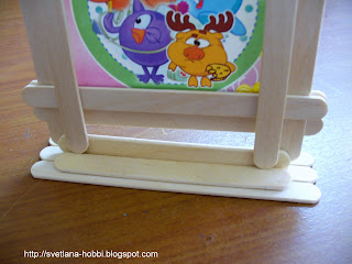 Теперь на нижнюю пару палочек наклеиваем палочку меньшего размера (это будет стопор для фото, чтобы не проваливалось), а на вертикальные стороны наносим по капельке клея.