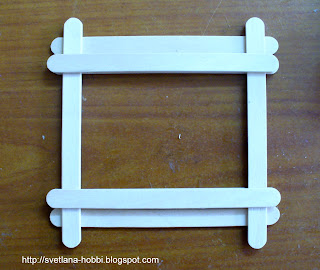 Клеем (я использовала акриловый, без запаха) склеиваем попарно 4 большие палочки . На них наклеиваем поперек еще две, формируя рамку. Вот так